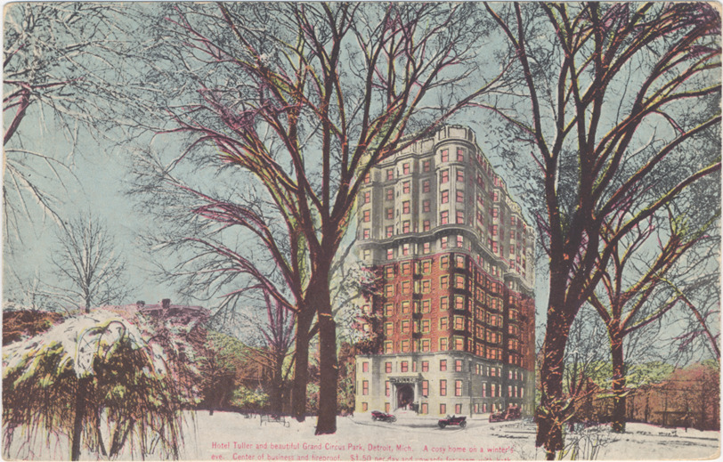 View of Hotel Tuller during winter. Multistory hotel is visible through bare trees in Grand Circus Park. Printed on front: "Hotel Tuller and beautiful Grand Circus Park, Detroit, Mich. A cosy [sic] home on a winter's eve. Center of business and fireproof. $1.50 per day and upwards for room with bath." Printed on back: "Made by Chilton Company, Phila., Pa., U.S.A., 2994." Message on back: "Detroit 8/22/11. Dear Sir: Answering yours of 17th ... we have made reservation for you for the [blank line]. We have forwarded to you[r] house by U.S. Express. Yours truly, Hotel Tuller, per [signed] L.W. Tuller, prop." Card is postmarked August 22, 1911.