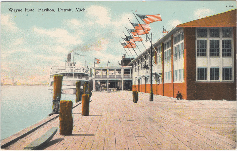 View of Wayne Hotel pavilion adjacent to waterfront; ferry docked next to pavilion. American flags displayed on building; dock in foreground. Printed on back: "Published by Wolverine News Co., Detroit, Mich. Made in U.S.A., A1634." Handwritten on back in upper right corner: "11/13/09."