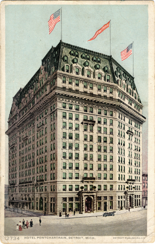View of Hotel Pontchartrain from corner. Multistory building has mansard roof; American flags and "Pontchartrain" flags displayed on roof. Printed on front: "12734, Hotel Pontchartrain, Detroit, Mich. Detroit Publishing Co." Printed on back: "Phostint card made only by Detroit Publishing Co." Handwritten message on back is partially covered by label. Card is postmarked August 5, 1914.