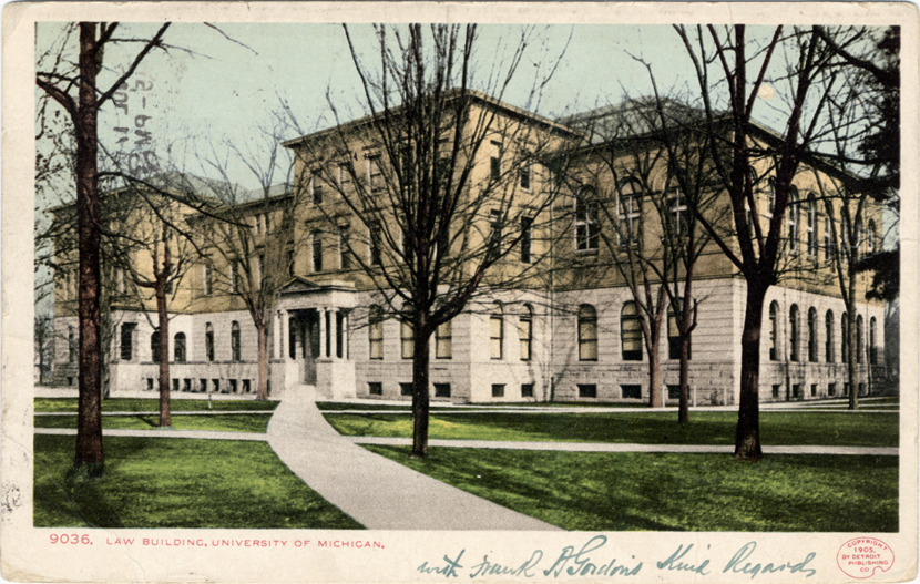 View of University of Michigan Law School building; building is partially obscured by trees. Sidewalks and lawn in foreground. Printed on front: "9036, Law building, University of Michigan. Copyright 1905 by Detroit Publishing Co." Handwritten on front: "With Frank A. Gordon's kind regards." Card is postmarked July 17, 1908.