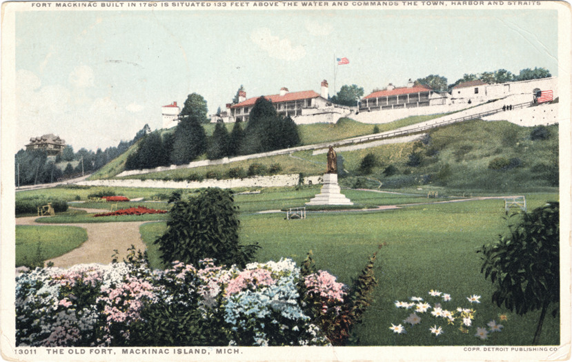 View of Fort Mackinac on hill at Mackinac Island. Park with statue on pedestal in foreground. Printed on front: "The old fort, Mackinac Island, Mich., 13011. Fort Mackinac built in 1780 is situated 133 feet above the water and commands the town, harbor and straits. Copr. Detroit Publishing Co." Printed on back: "Phostint made only by Detroit Publishing Co." Handwritten on back: "Sweet Marie, Having heard of your serious illness due to lack of sleep and food, I hasten to extend my deepest sympathy. Lovingly ... " Card is postmarked August 6, 1917.