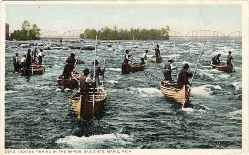 View of men standing in canoes in river rapids. Men hold poles; truss bridge in background. Printed on front: "5643, Indians fishing in the rapids, Sault Ste. Marie, Mich." Printed on back: "Phostint card made only by Detroit Publishing Co." Handwritten on back in upper right corner: "8/9/12."