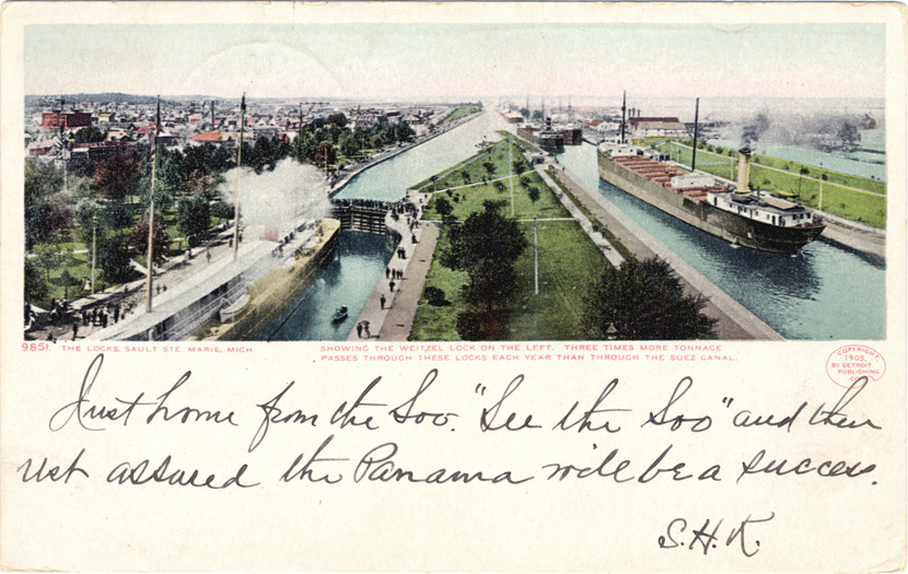 View of two freighters in Soo Locks; visitors stand on walkways observing Locks. Houses in background. Printed on front: "The Locks, Sault Ste. Marie, Mich., 9851 showing the Weitzel Lock on the left. Three times more tonnage passes through these locks each year than through the Suez Canal. Copyright 1905 by Detroit Publishing Co." Handwritten on front: "Just home from the Soo. 'See the Soo' and then rest assured the Panama will be a success. S.H.K." Printed on back: "Phostint card made only by Detroit Publishing Co." Card is postmarked August 10, 1907.