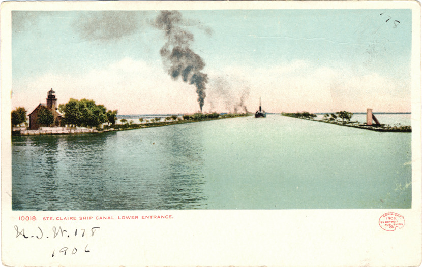 View of ship traveling on St. Clair shipping canal; lighthouse in foreground. Printed on front: "10018, Ste. Claire ship canal, lower entrance. Copyright 1906 by Detroit Publishing Co." Handwritten on front: "N.J.W. 178, 1906."