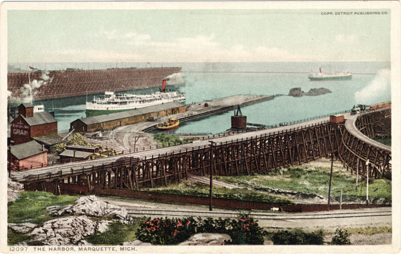 View of harbor at Marquette, Michigan. Freighters near shore; train travels on trestle bridge in foreground. Printed on front: "The harbor, Marquette, Mich., 12097. Copr. Detroit Publishing Co." Printed on back: "Phostint card made only by Detroit Publishing Co." Handwritten on back in upper right corner: "8/9/12."