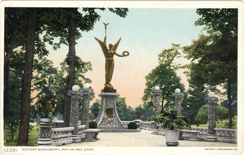 View of Victory monument at Put-in-Bay, Ohio. Monument has statue of winged woman carrying wreath and scepter atop a rustic stone pedestal. Monument surrounded by stone balustrade and rustic stone columns with Ionic capitals. Printed on front: "12381, Victory Monument, Put-in-Bay, Ohio. Detroit Publishing Co." Printed on back: "Phostint card made only by Detroit Publishing Co." Handwritten on back in upper right corner: "7/24/16."