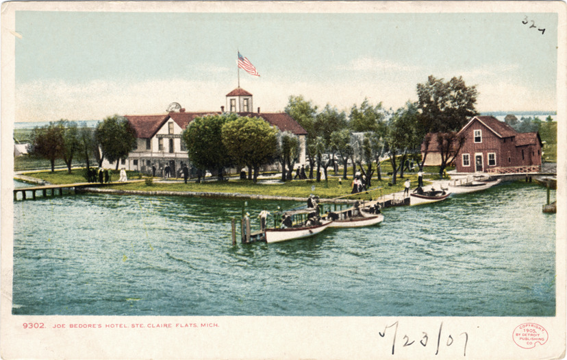 View of Joe Bedore's Hotel at St. Clair Flats on waterfront. Boats moored next to dock in foreground; boathouse at end of dock on shore. Printed on front: "9302, Joe Bedore's Hotel, Ste. Claire Flats, Mich. Copyright 1905 by Detroit Publishing Co." Handwritten on front: "5/23/07."