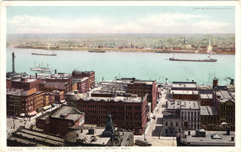 View of Detroit River from Woodward and Griswold. Freighters travel on river; commercial buildings in foreground. Printed on front: "Foot of Woodward Ave. and Griswold St., Detroit, Mich., 12666. Copr. Detroit Publishing Co." Printed on back: "Phostint card made only by Detroit Publishing Co." Handwritten on back in upper right corner: "10/8/09."