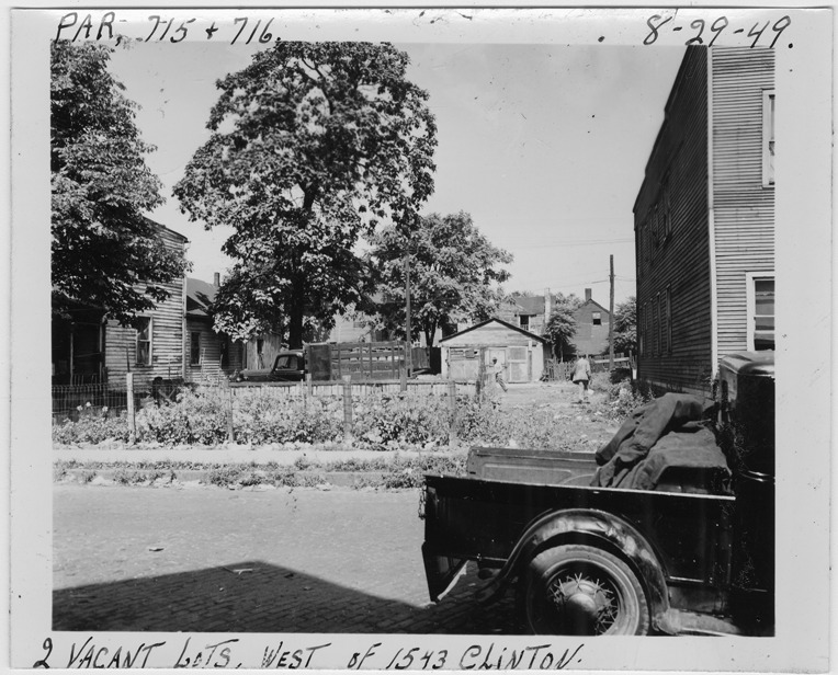 View of empty lots located west of 1543 Clinton, parcels 715 and 716, in the area bounded by Hastings/Dequindre/Clinton/Mullett. Fence in front of lots; stake truck parked in lot. Truck parked in foreground. Handwritten on front: "Par. 715 & 716, 2 vacant lots west of 1543 Clinton, 8-29-49."