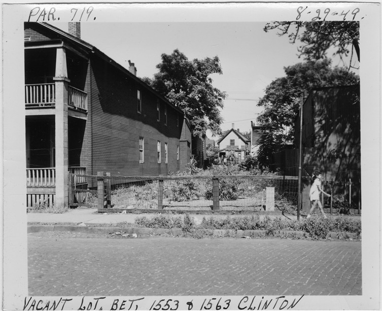 View of empty lot located between 1553 and 1563 Clinton, parcel 719, in the area bounded by Hastings/Dequindre/Clinton/Mullett. Lot has fence; young girl walks along sidewalk. Handwritten on front: "Par. 719, vacant lot bet. 1553 & 1563 Clinton, 8-29-49."
