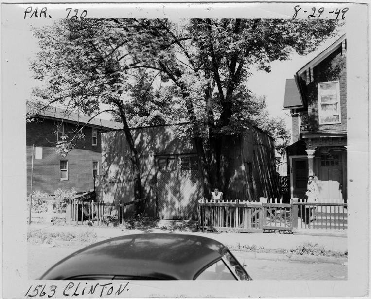 View of corrugated metal garage located at 1563 Clinton, parcel 720, in the area bounded by Hastings/Dequindre/Clinton/Mullett. Woman leans against fence adjacent to garage; another woman stands on porch of adjacent residence. Handwritten on front: "Par. 720, 1563 Clinton, 8-29-49."