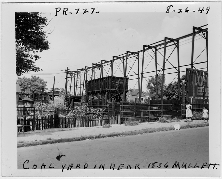 View of coal hopper and tall metal structure at Hall Coal Co. located at 1836 Mullett, parcel 727, in the area bounded by Hastings/Dequindre/Clinton/Mullett. Adjacent lot has vegetable garden; two girls walk along sidewalk. Handwritten on front: "Pr. 727, coal yard in rear, 1836 Mullett, 8-26-49."