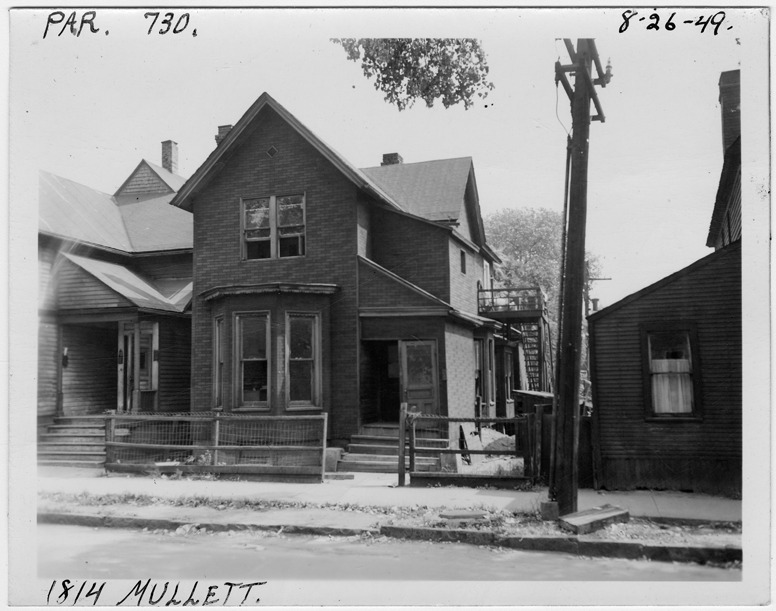View of two-story house with simulated brick siding located at 1814 Mullett, parcel 730, in the area bounded by Hastings/Dequindre/Clinton/Mullett. House has bay window; front yard has fence. Handwritten on front: "Par. 730, 1814 Mullett, 8-26-49."