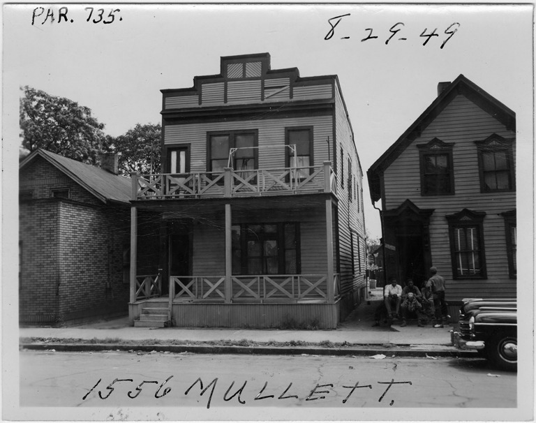 View of two-story wooden-frame house located at 1556 Mullett, parcel 735, in the area bounded by Hastings/Dequindre/Clinton/Mullett. Automobile parked in street; house has porches on each level. Group of men sit on porch of adjacent residence at 1552 Mullett. Handwritten on front: "Par. 735, 1556 Mullett, 8-29-49."