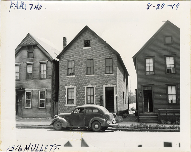 View of front-gabled two-story house with simulated brick siding located at 1516 Mullett, parcel 740, in the area bounded by Hastings/Dequindre/Clinton/Mullett. Car parked in front of house. Handwritten on front: "Par. 740, 1516 Mullett, 8-29-49."