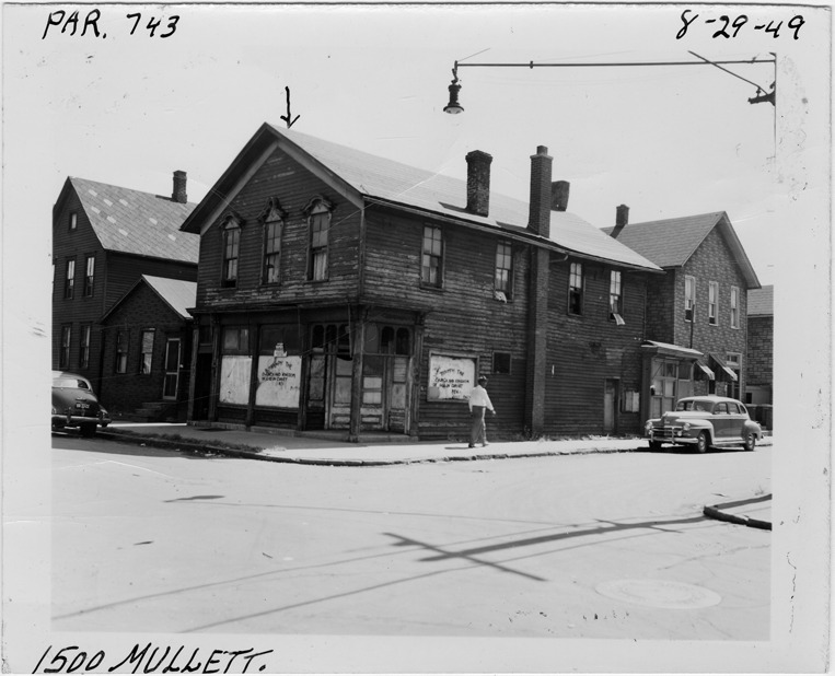 Front and side view of two-story front-gabled wooden-frame building located at 1500 Mullett, parcel 743, in the area bounded by Hastings/Dequindre/Clinton/Mullett. Sign in windows on first level: "Triumph the church and kingdom of God in Christ, Rev." Man walks on sidewalk; automobile parked in street. Arrow drawn on photograph points toward building on corner. Handwritten on front: "Par. 743, 1500 Mullett, 8-29-49."