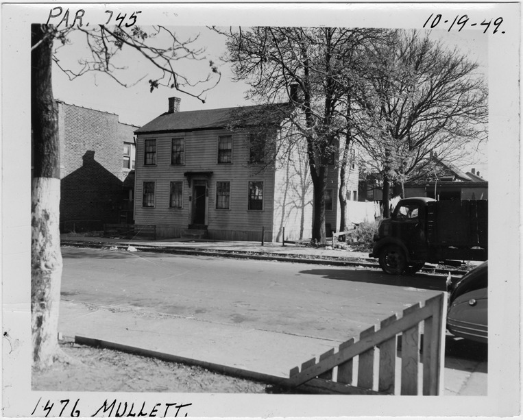 View of two-story side-gabled wooden-frame house located at 1476 Mullett, parcel 745, in the area bounded by Hastings/Dequindre/Clinton/Mullett. Truck parked in street. Handwritten on front: "Par. 745, 1476 Mullett, 10-19-49."