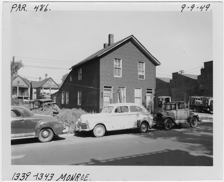 View of two-story front-gabled house with simulated brick siding located at 1339-1343 Monroe, parcel 486, in the area bounded by Hastings/Dequindre/Monroe/Macomb. Cars parked in street. Handwritten on front: "Par. 486, 1339-1343 Monroe, 9-9-49."