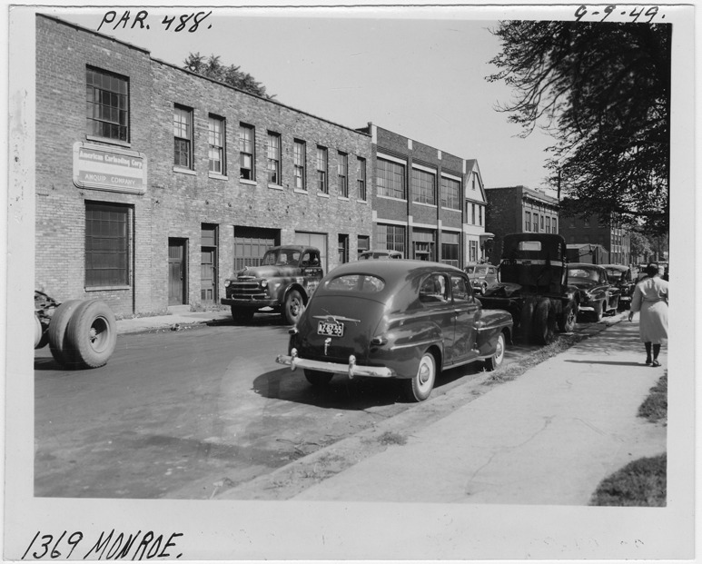 View at an angle of two-story brick factory building located at 1369 Monroe, parcel 488, in the area bounded by Hastings/Dequindre/Monroe/Macomb. Sign on adjacent building: "American Carloading Corp., Amquip Company." Cars and trucks parked in street. Handwritten on front: "Par. 488, 1369 Monroe, 9-9-49."