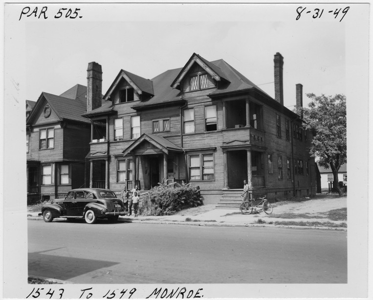 View of two-story wooden-frame apartment building located at 1543-1549 Monroe, parcel 505, in the area bounded by Hastings/Dequindre/Monroe/Macomb. Group of boys pose in front of house; bicycle and car in front of house. Handwritten on front: "Par. 505, 1543 to 1549 Monroe, 8-31-49."
