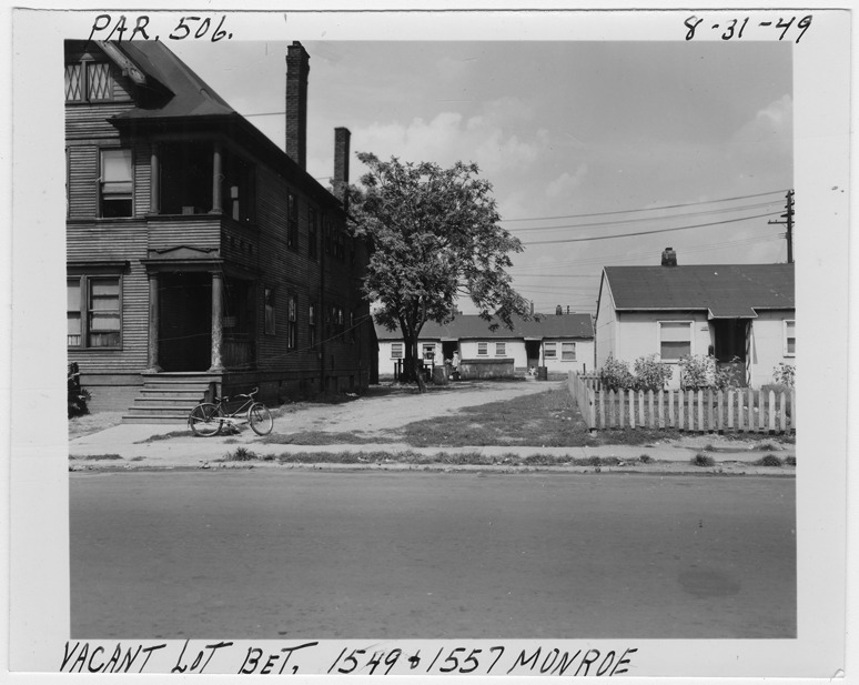 View of empty lot located between 1549 and 1557 Monroe, parcel 506, in the area bounded by Hastings/Dequindre/Monroe/Macomb. Bicycle parked in front of adjacent residence; row houses in background. Handwritten on front: "Par. 506, vacant lot bet. 1549 & 1557 Monroe, 8-31-49."