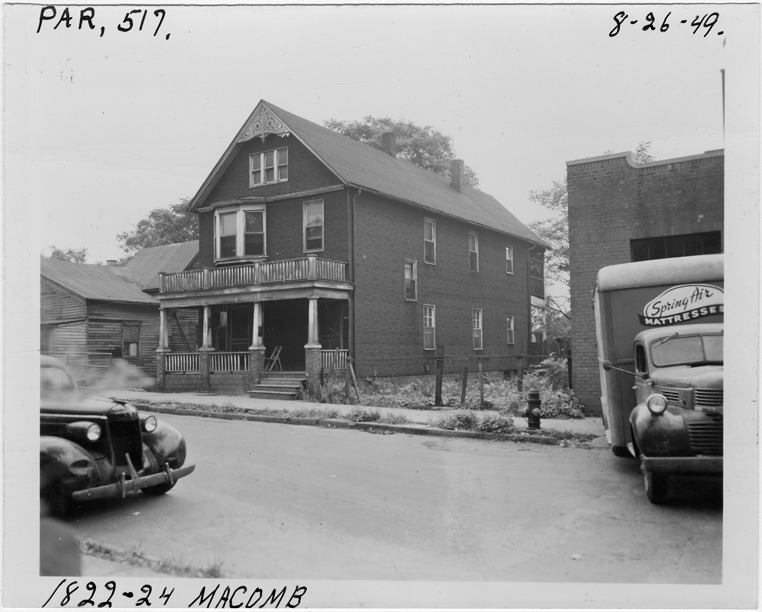 View of two-story front-gabled house with simulated brick siding, possibly a duplex, located at 1822-1824 Macomb, parcel 517, in the area bounded by Hastings/Dequindre/Monroe/Macomb. House has covered entry porch and decorative vergeboards. Spring Air mattresses truck parked in street. Handwritten on front: "Par. 517, 1822-24 Macomb, 8-26-49."