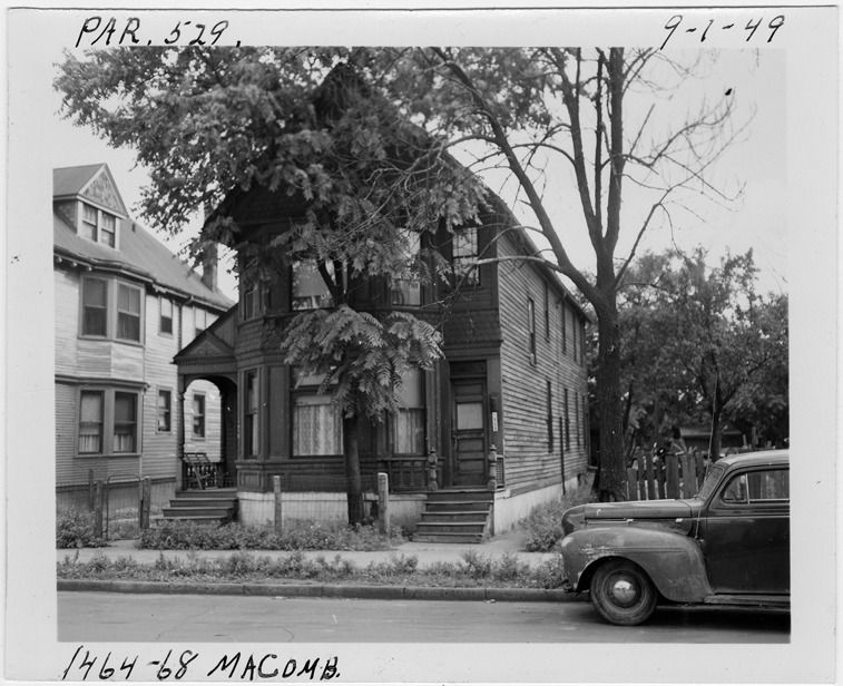 View of two-story wooden-frame house, possibly a duplex, located at 1464-1468 Macomb, parcel 529, in the area bounded by Hastings/Dequindre/Monroe/Macomb. House has two front entrances and bay windows. Handwritten on front: "Par. 529, 1464-68 Macomb, 9-1-49."