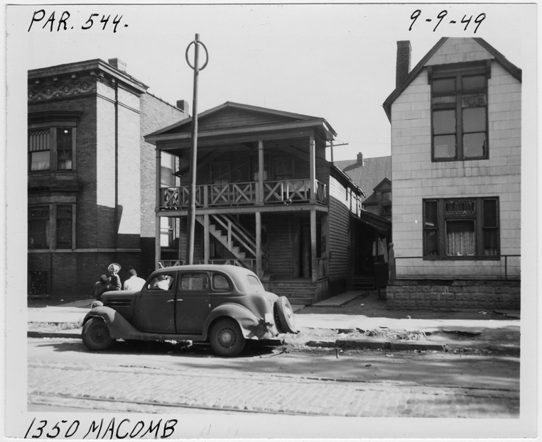 View of two-story wooden-frame house located at 1350 Macomb, parcel 544, in the area bounded by Hastings/Dequindre/Monroe/Macomb. House has covered porches; automobile parked in street. Handwritten on front: "Par. 544, 1350 Macomb, 9-9-49."