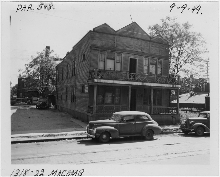 View of two-story wooden-frame apartment building located at 1318-1322 Macomb, parcel 548, in the area bounded by Hastings/Dequindre/Monroe/Macomb. Cars parked in street. Handwritten on front: "Par. 548, 1318-22 Macomb, 9-9-49."