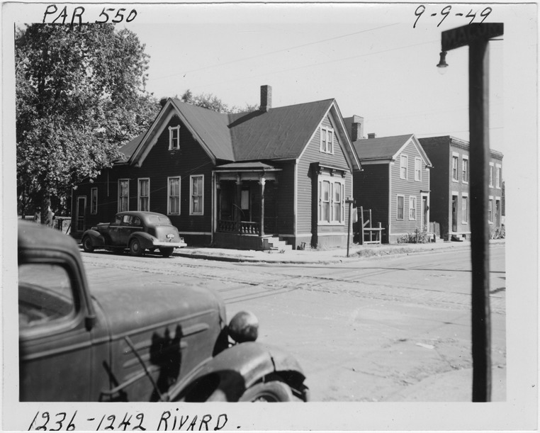 Front and side view of two adjacent one-story wooden-frame houses, located at 1236-1242 Rivard, parcel 550, in the area bounded by Hastings/Dequindre/Monroe/Macomb. Automobiles parked in street. Handwritten on front: "Par. 550, 1236-1242 Rivard, 9-9-49."