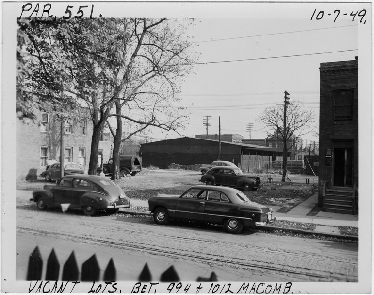 View of cars parked in empty lot located between 994 and 1012 Macomb, parcel 551, in the area bounded by Hastings/Dequindre/Monroe/Macomb. Large shed in background. Handwritten on front: "Par. 551, vacant lots bet. 994 & 1012 Macomb, 10-7-49."