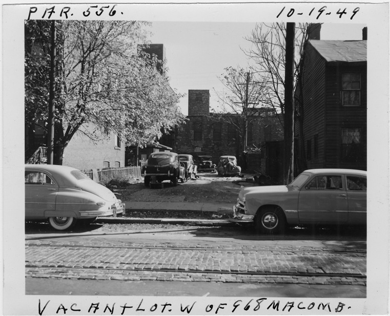 View of empty lot located west of 968 Macomb, parcel 556, in the area bounded by Hastings/Dequindre/Monroe/Macomb. Automobiles parked in street and lot. Handwritten on front: "Par. 556, vacant lot W. of 968 Macomb, 10-19-49."