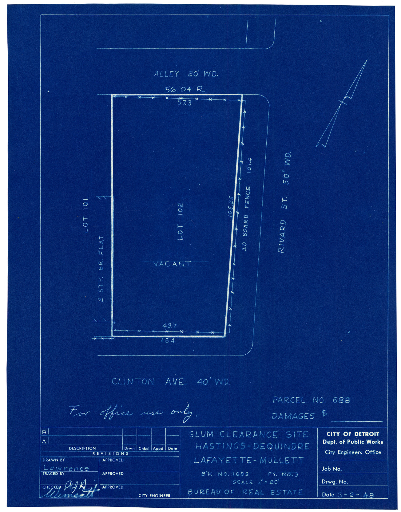 Plot plan for property located on Clinton, parcel 688. Recorded on blueprint: "Slum clearance site; Hastings, Dequindre, Lafayette, Mullett."