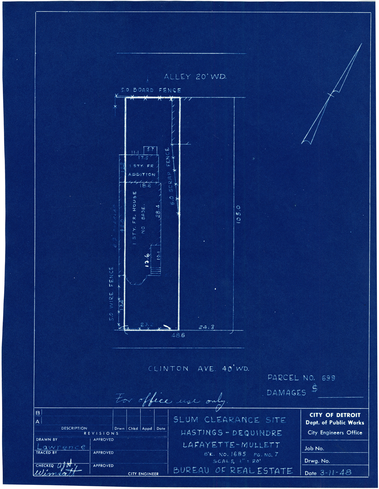 Part of a collection that contains condemnation files, photographs, blueprints and descriptions of slum clearance housing parcels for the City of Detroit. Of particular note are areas which included the neighborhoods known as Paradise Valley, Black Bottom, Corktown and the Jeffries Housing Project.