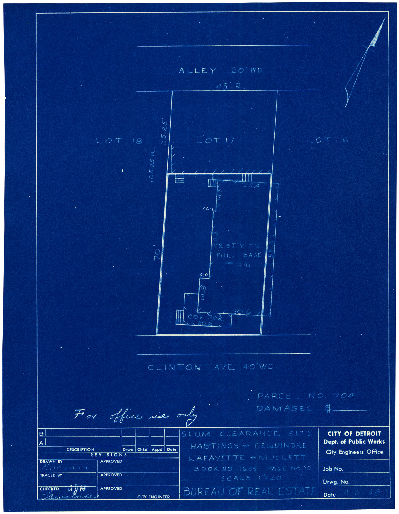 Part of a collection that contains condemnation files, photographs, blueprints and descriptions of slum clearance housing parcels for the City of Detroit. Of particular note are areas which included the neighborhoods known as Paradise Valley, Black Bottom, Corktown and the Jeffries Housing Project.