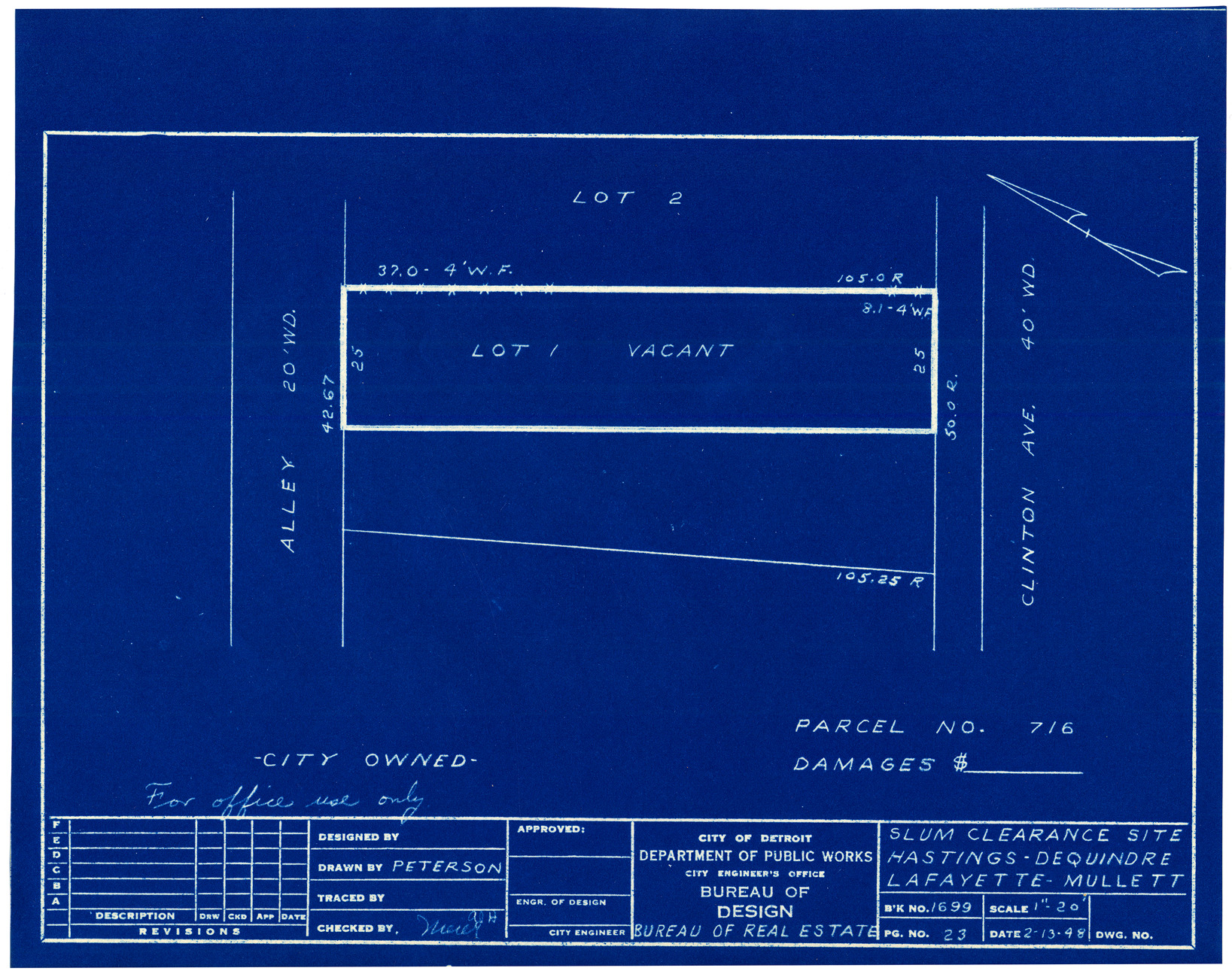 Plot plan for property located on Clinton, parcel 716. Recorded on blueprint: "Slum clearance site; Hastings, Dequindre, Lafayette, Mullett."