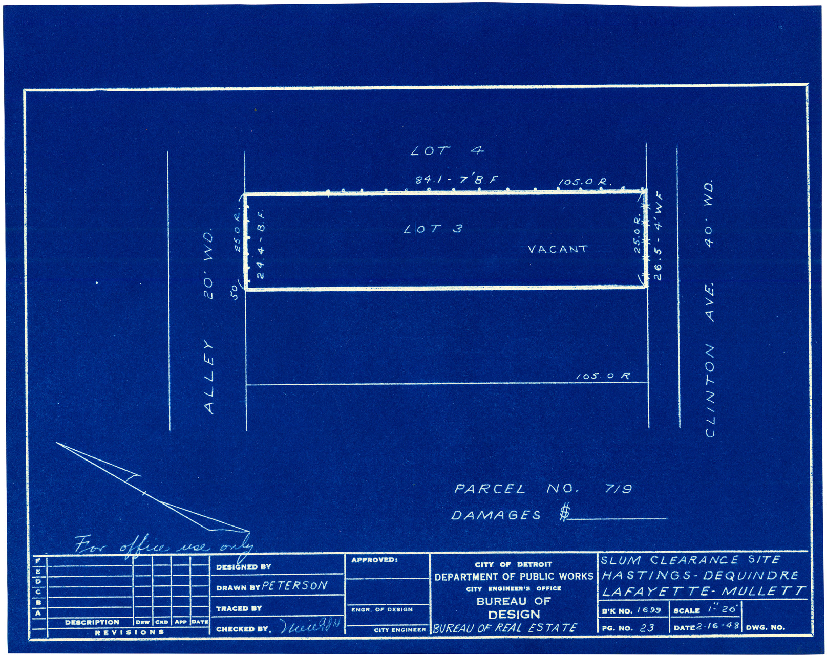 Part of a collection that contains condemnation files, photographs, blueprints and descriptions of slum clearance housing parcels for the City of Detroit. Of particular note are areas which included the neighborhoods known as Paradise Valley, Black Bottom, Corktown and the Jeffries Housing Project.