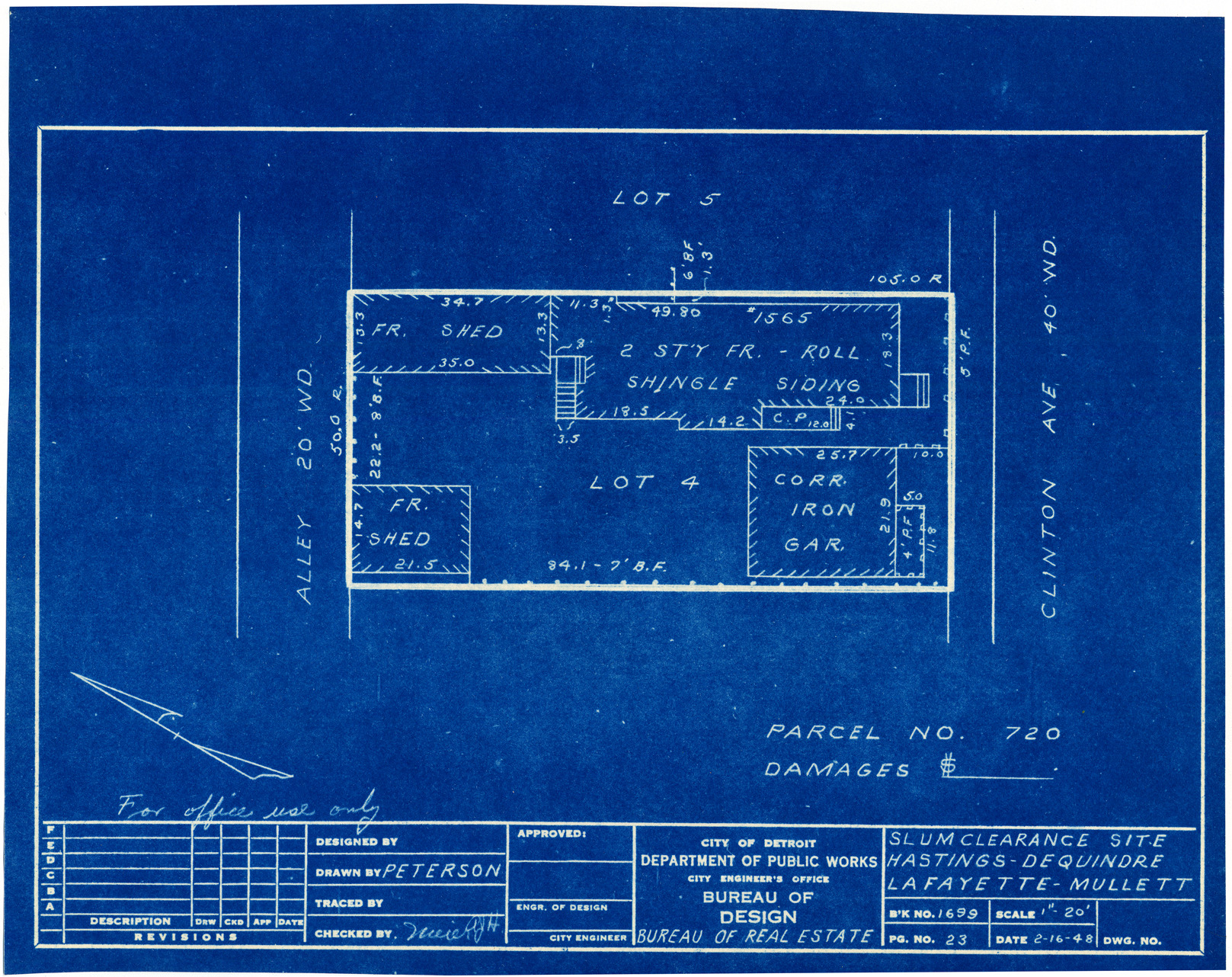 Part of a collection that contains condemnation files, photographs, blueprints and descriptions of slum clearance housing parcels for the City of Detroit. Of particular note are areas which included the neighborhoods known as Paradise Valley, Black Bottom, Corktown and the Jeffries Housing Project.