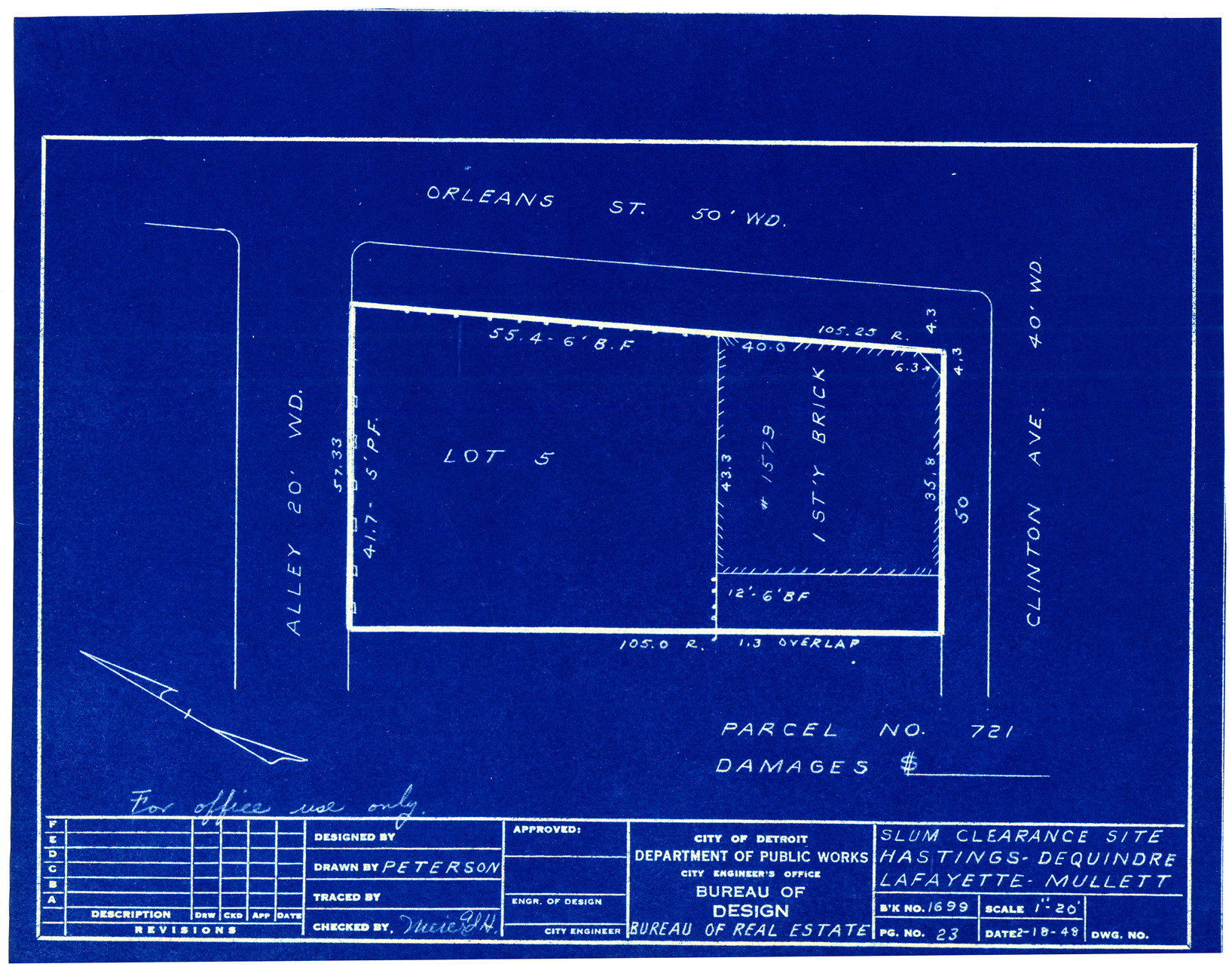 Part of a collection that contains condemnation files, photographs, blueprints and descriptions of slum clearance housing parcels for the City of Detroit. Of particular note are areas which included the neighborhoods known as Paradise Valley, Black Bottom, Corktown and the Jeffries Housing Project.