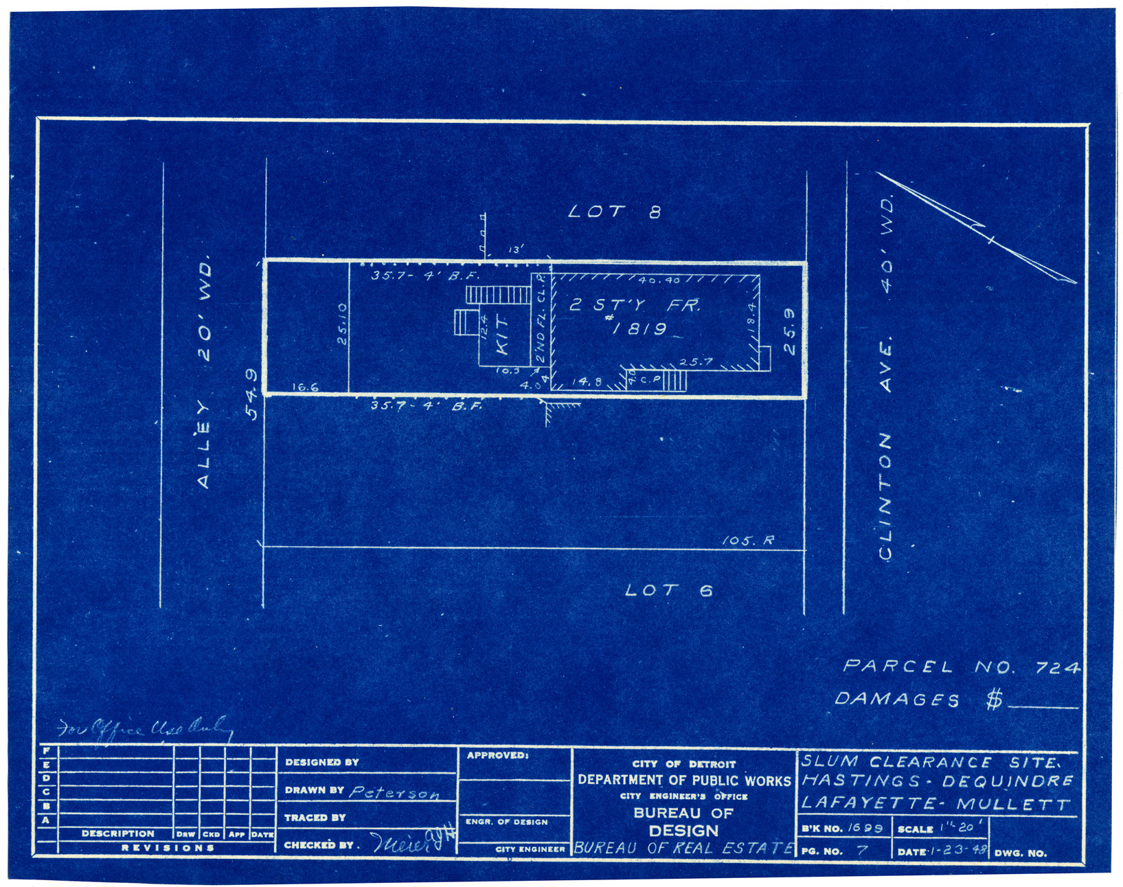 Plot plan for property located on Clinton, parcel 724. Recorded on blueprint: "Slum clearance site; Hastings, Dequindre, Lafayette, Mullett."