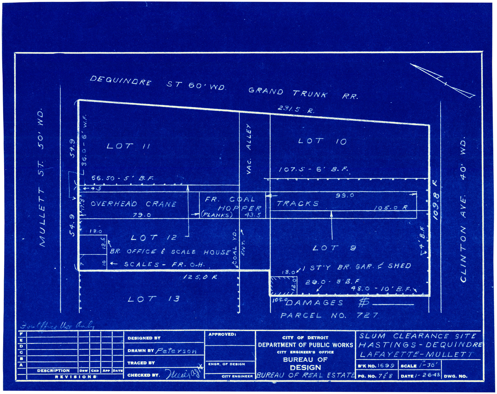 Plot plan for property bordered by Clinton, Mullett and Dequindre, parcel 727. Recorded on blueprint: "Slum clearance site; Hastings, Dequindre, Lafayette, Mullett."