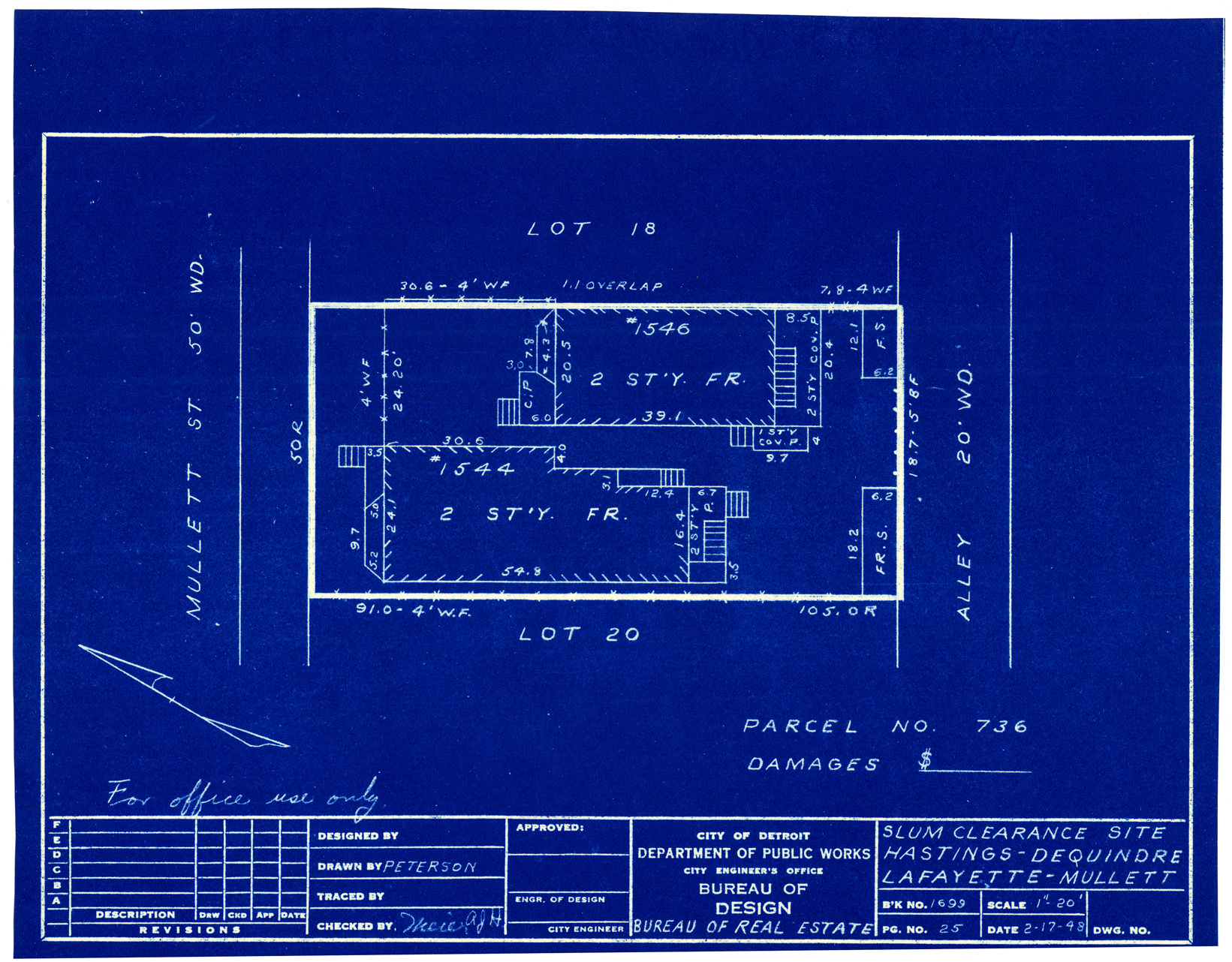 Part of a collection that contains condemnation files, photographs, blueprints and descriptions of slum clearance housing parcels for the City of Detroit. Of particular note are areas which included the neighborhoods known as Paradise Valley, Black Bottom, Corktown and the Jeffries Housing Project.