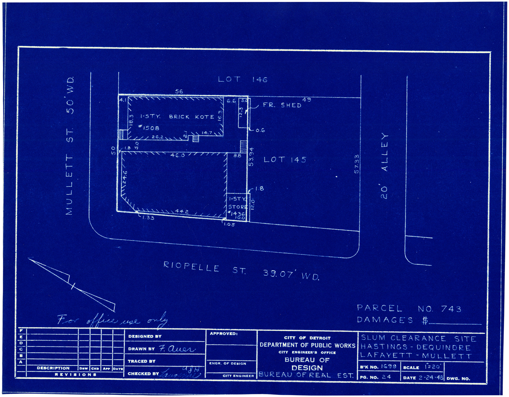 Plot plan for property located on the corner of Mullett and Riopelle, parcel 743. Recorded on blueprint: "Slum clearance site; Hastings, Dequindre, Lafayette, Mullett."