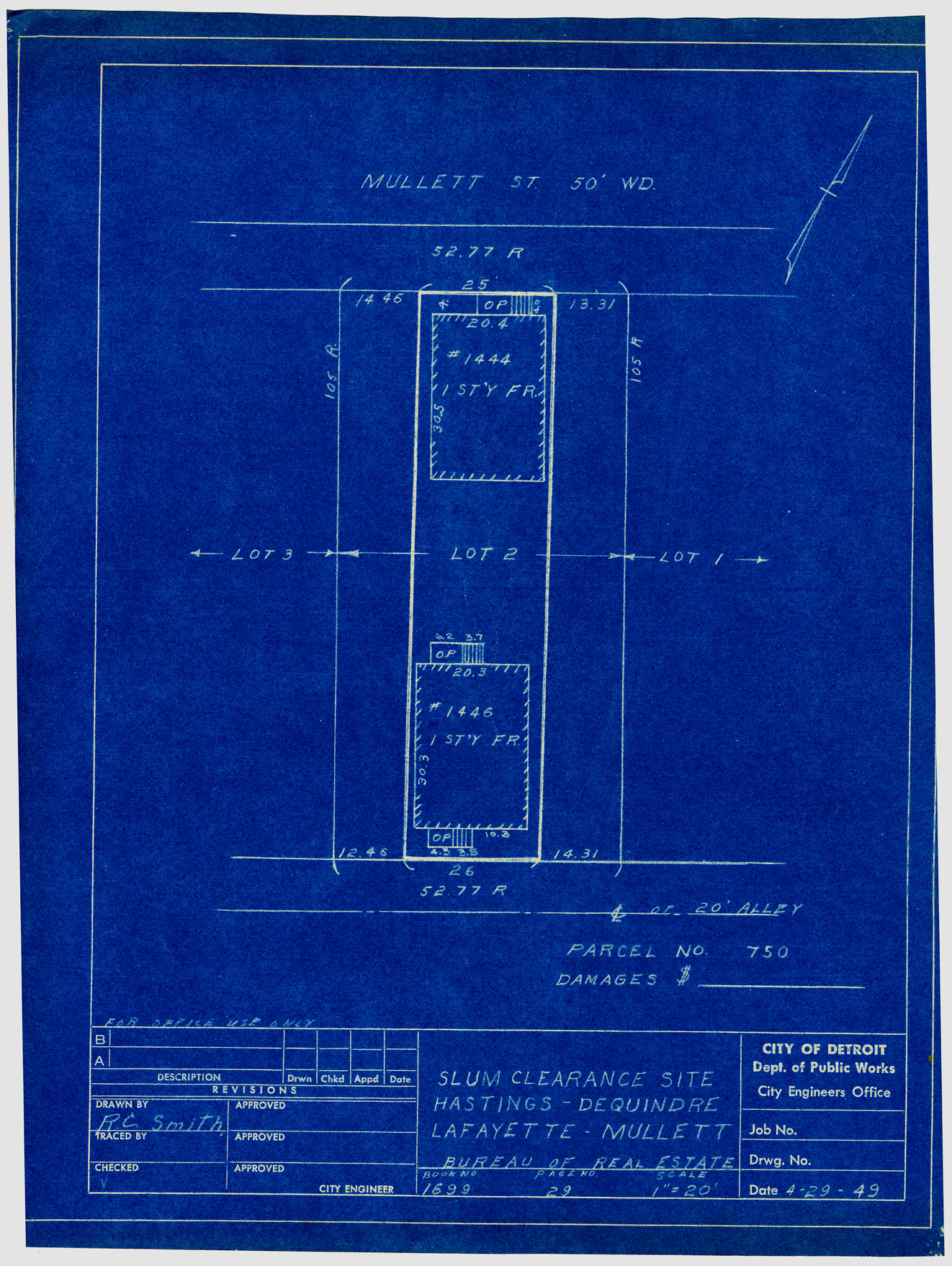 Plot plan for property located on Mullett, parcel 750. Recorded on blueprint: "Slum clearance site; Hastings, Dequindre, Lafayette, Mullett."