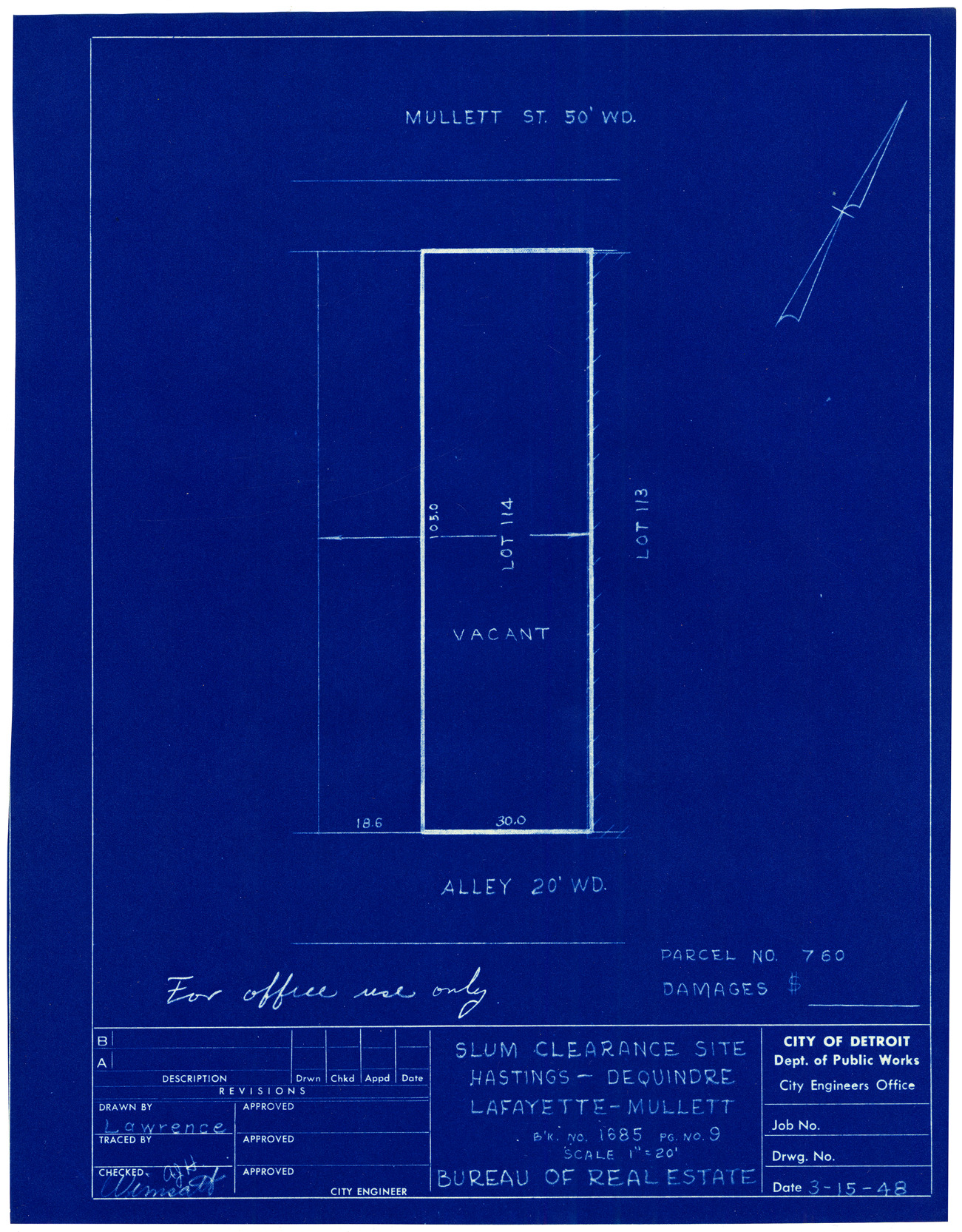 Plot plan for property located on Mullett, parcel 760. Recorded on blueprint: "Slum clearance site; Hastings, Dequindre, Lafayette, Mullett."