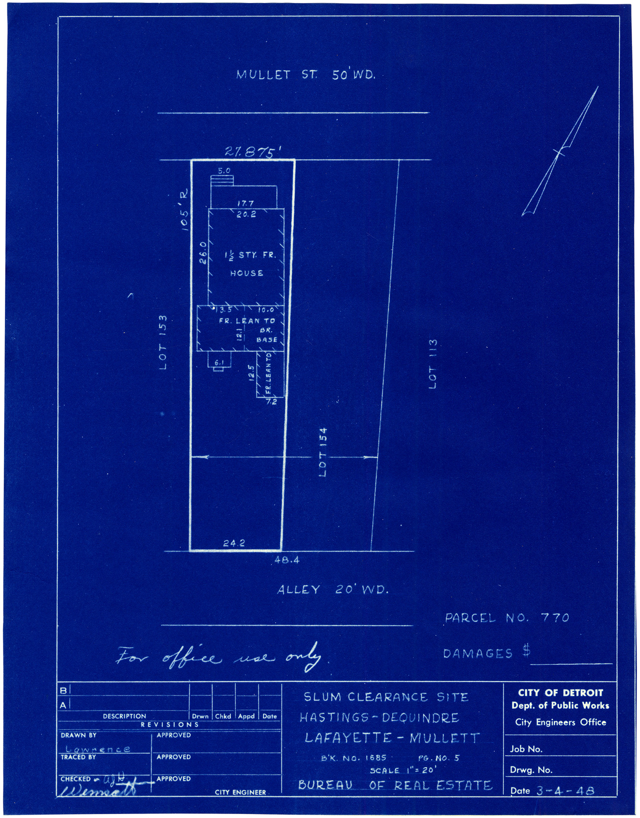 Plot plan for property located on Mullett, parcel 770. Recorded on blueprint: "Slum clearance site; Hastings, Dequindre, Lafayette, Mullett."