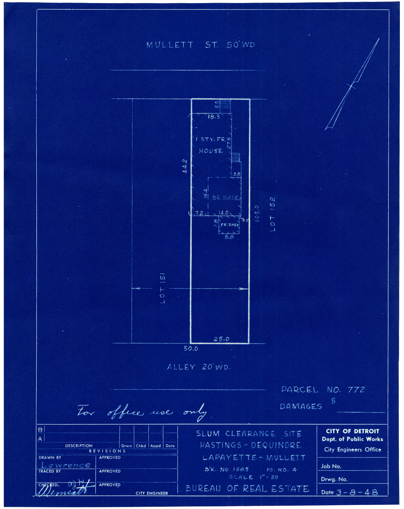 Part of a collection that contains condemnation files, photographs, blueprints and descriptions of slum clearance housing parcels for the City of Detroit. Of particular note are areas which included the neighborhoods known as Paradise Valley, Black Bottom, Corktown and the Jeffries Housing Project.