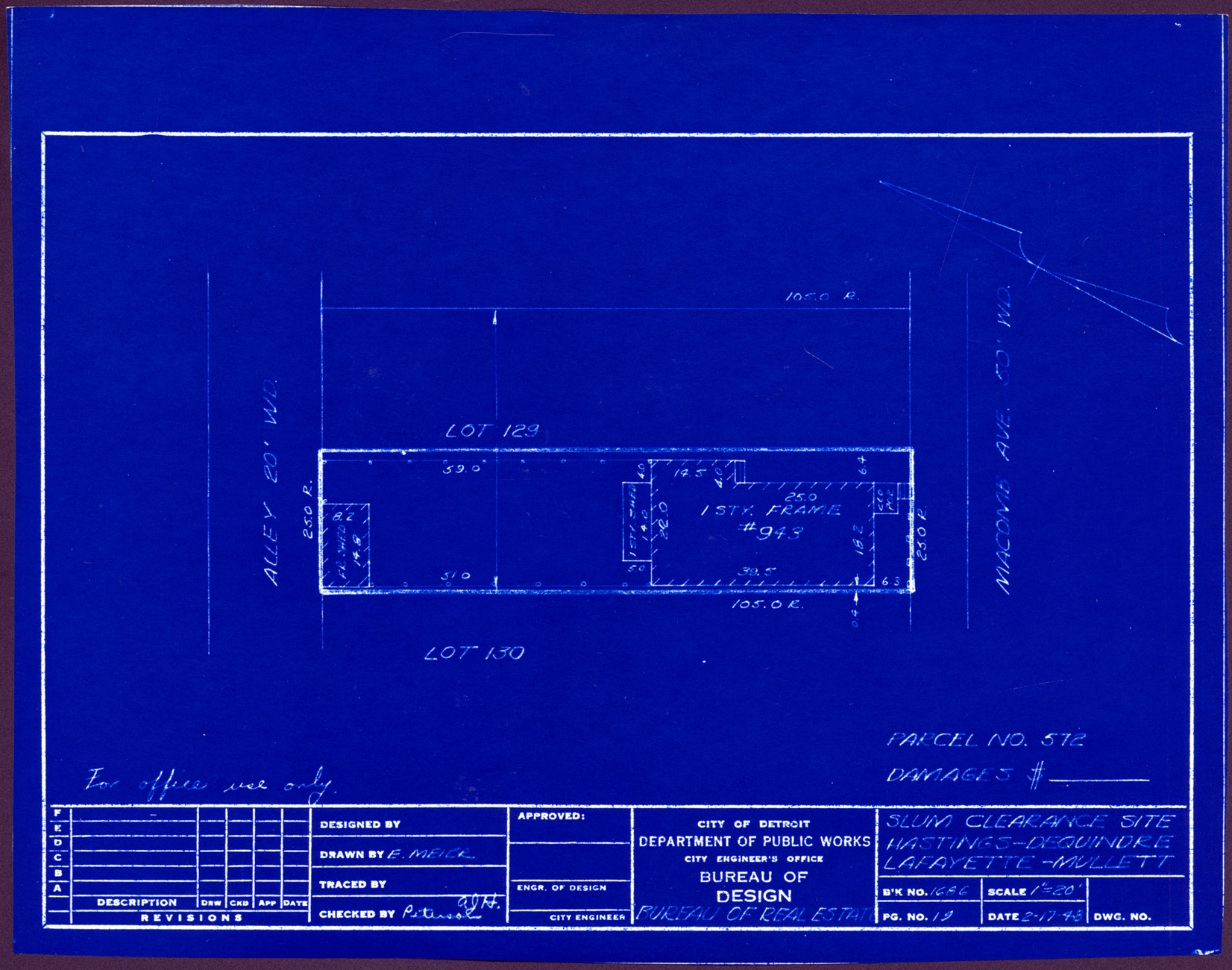 Part of a collection that contains condemnation files, photographs, blueprints and descriptions of slum clearance housing parcels for the City of Detroit. Of particular note are areas which included the neighborhoods known as Paradise Valley, Black Bottom, Corktown and the Jeffries Housing Project.