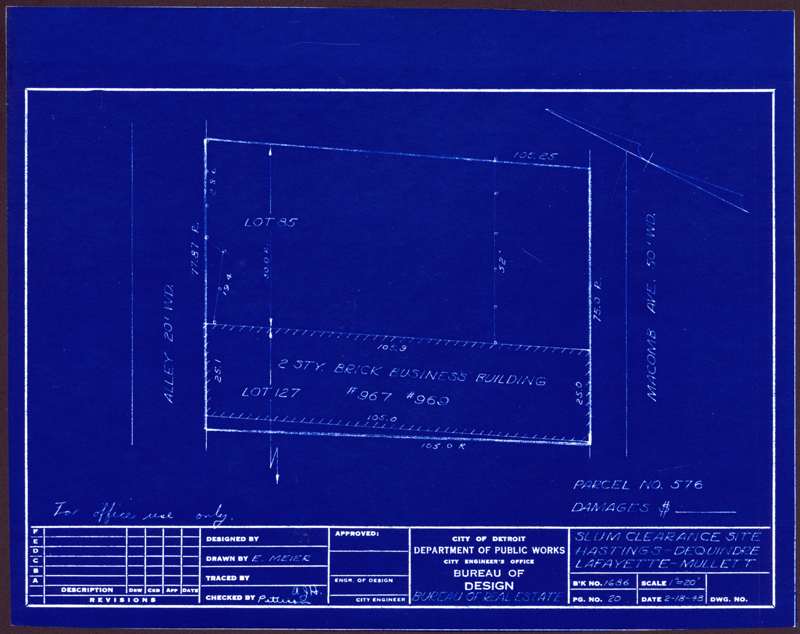 Plot plan for property located on Macomb, parcel 576. Recorded on blueprint: "Slum clearance site; Hastings, Dequindre, Lafayette, Mullett."