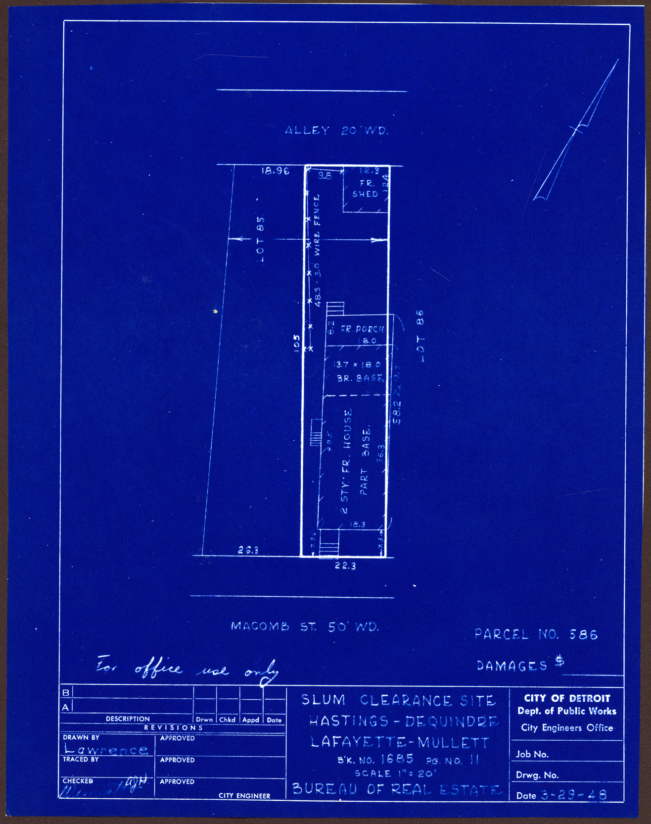 Plot plan for property located on Macomb, parcel 586. Recorded on blueprint: "Slum clearance site; Hastings, Dequindre, Lafayette, Mullett."